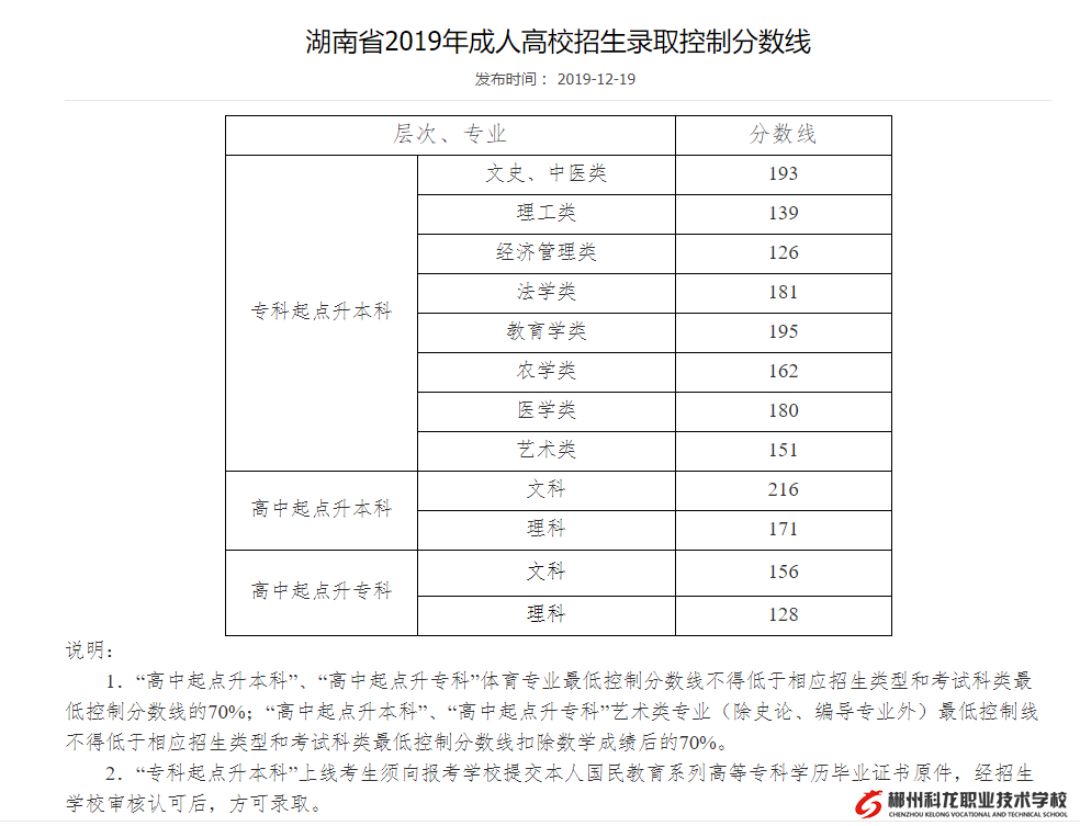 湖南省2019年成人高校招生录取控制分数线